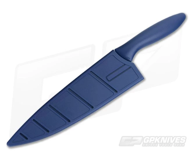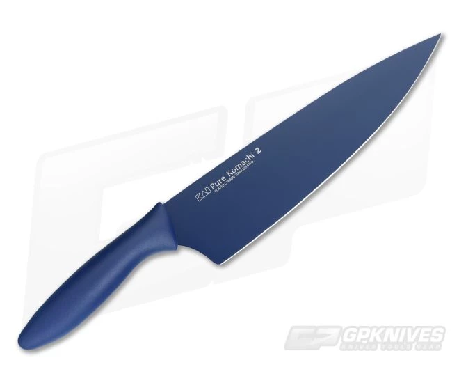 KAI Pure Komachi 2 8.5″ Chef Knife Navy Blue with matching resin handle. Each knife in the Pure Komachi 2 line features a bright and unique color code to prevent cross contamination during food preparation. The handles are ergonomically designed for right or left handed use. Includes a color matched plastic sheath to protect the blade when not in use.