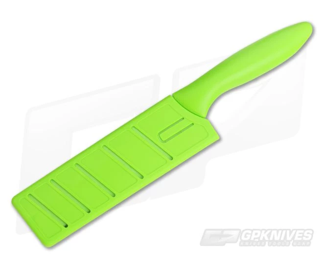 KAI Pure Komachi 2 Hollow-Ground Nakiri Knife in lime green with matching resin handle. Each knife in the Pure Komachi 2 line features a bright and unique color code to prevent cross contamination during food preparation. The handles are ergonomically designed for right or left handed use. Includes a color matched plastic sheath to protect the blade when not in use.