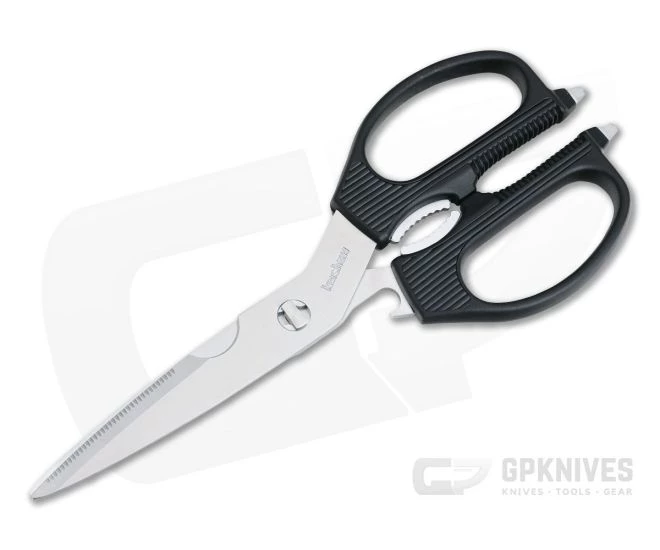 Kershaw Taskmaster Kitchen Shears with razor sharp stainless steel tempered cutting blades and co-polymer handle. Grips comfortable left or right-handed. Blades disassemble for easy cleaning. Bottle opener, nut cracker, bone notch and lid lifter/screwdriver. Use for game, fish, poultry and in the kitchen.