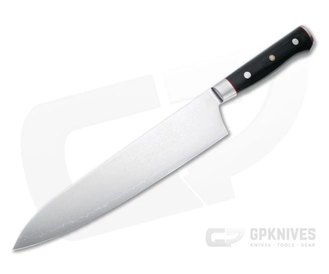 Handle: The modified European style handle has a hidden tang construction for clean aesthetics with a durable black Pakkawood framed by red liners and attached with two stainless pins and a single mosaic pin. A stainless steel butt cap and bolster round out construction for a lightweight and well-balanced handle.