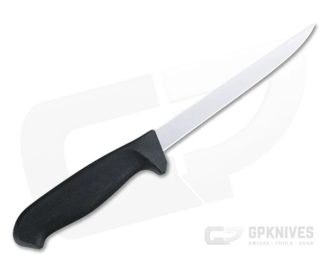 The Mora Frosts Professional 7″ Narrow Fillet knife is perfect for use in the kitchen, campground or butcher shop. Semi-flexible and thin this knife cuts with precision thanks to a fine, flat ground stainless steel blade and textured, glass reinforced polypropylene handle that is ergonomic and secure for all day use.