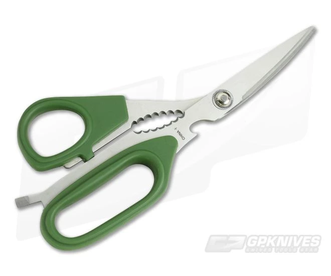 Remington Cutlery Game Shears with full stainless steel construction and green polypropylene handles for comfortable use. Two and a half inches plus of cutting edge. Convenient bottle opener inside handles.