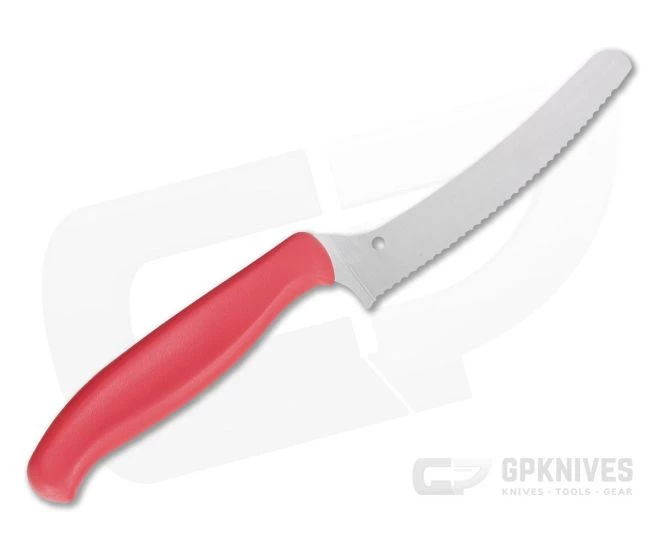 The Spyderco’s Z-Cut knife combines all the advantages of an offset design with a high performance CTS-BD1N stainless steel blade making it a multi-functional food prep powerhouse. Available with a choice of a plain-edged or fully serrated cutting edge, pointed or blunt tip and four color options, there is a Z-Cut for any purpose. This version comes with a Blunt Tip, Serrated Edge and Red handle.