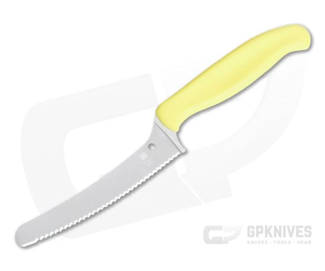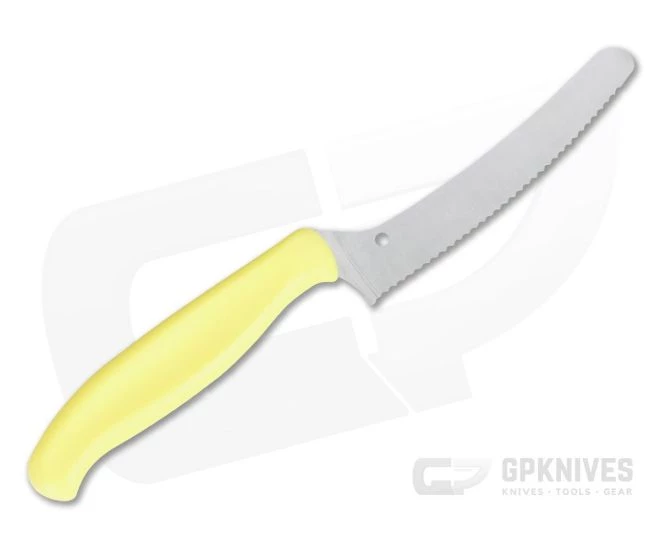 The Spyderco’s Z-Cut knife combines all the advantages of an offset design with a high performance CTS-BD1N stainless steel blade making it a multi-functional food prep powerhouse. Available with a choice of a plain-edged or fully serrated cutting edge, pointed or blunt tip and four color options, there is a Z-Cut for any purpose. This version comes with a Blunt Tip, Serrated Edge and Yellow handle.