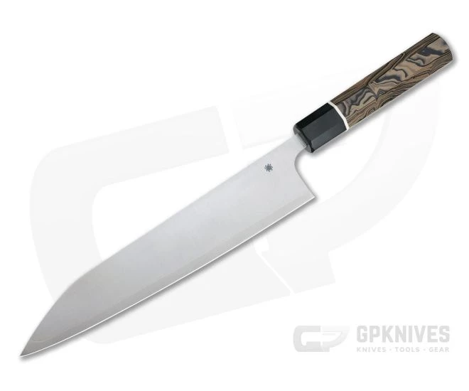 Handle: The handle is a traditional octagonal shape that is comfortable in multiple grips and made from smooth, Burl G10 for a wood like look. Black G10 ferrules with contrasting white liners lend a more traditional style without compromising performance or comfort. The material is durable, nonporous, heat-resistant, and easy to clean. The extra weight of the material gives the knife a nice balance during extended use.
