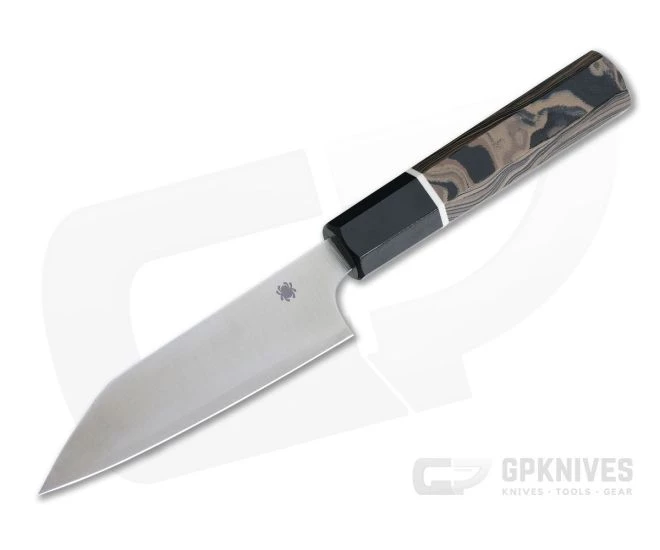 Handle: The handle is a traditional octagonal shape that is comfortable in multiple grips and made from smooth, Burl G10 for a wood like look. Black G10 ferrules with contrasting white liners lend a more traditional style without compromising performance or comfort. The material is durable, nonporous, heat-resistant, and easy to clean. The extra weight of the material gives the knife a nice balance during extended use.