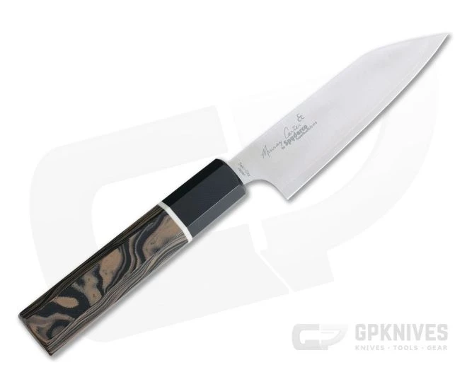 Blade: The fully flat ground blade is san mai SUS410 stainless steel with an Aogami Super Blue core. The outer layers of tough, stainless steel protect and support the ultra-hard carbon-steel center layer that forms the blade’s edge. The Petty makes an excellent slicer that can handle detailed cutting chores with a handsome machine satin finish with polished edges and distinctive laminate line that gives the knife a high-end look.