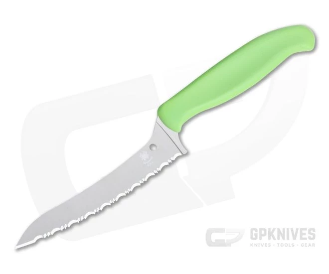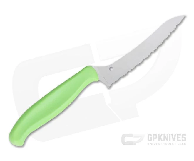 The Spyderco’s Z-Cut knife combines all the advantages of an offset design with a high performance CTS-BD1N stainless steel blade making it a multi-functional food prep powerhouse. Available with a choice of a plain-edged or fully serrated cutting edge, pointed or blunt tip and four color options, there is a Z-Cut for any purpose. This version comes with a Pointed Tip, SpyderEdge Serrations and Green handle.