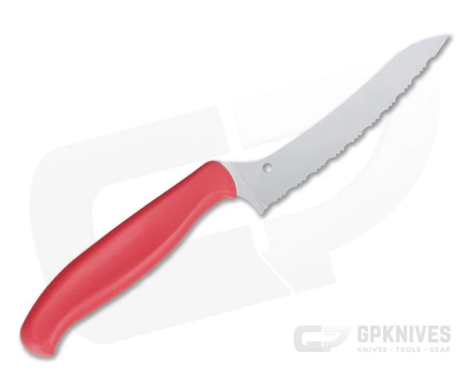 The Spyderco’s Z-Cut knife combines all the advantages of an offset design with a high performance CTS-BD1N stainless steel blade making it a multi-functional food prep powerhouse. Available with a choice of a plain-edged or fully serrated cutting edge, pointed or blunt tip and four color options, there is a Z-Cut for any purpose. This version comes with a Pointed Tip, SpyderEdge Serrations and Red handle.