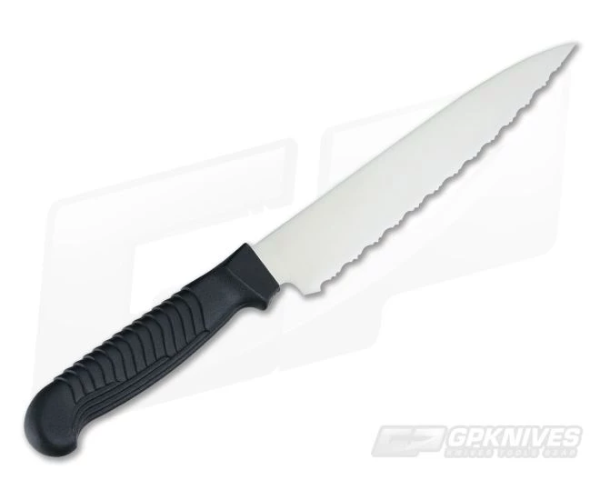 The Spyderco Kitchen Knife Series has been resurrected for 2014 including their original MBS-26 blade steel. This Spyderco 6″ Utility Knife features a thin, flat ground and fully two-step serrated edge MBS-26 stainless blade. The steel was chosen specifically by Spyderco for kitchen use as it has proven edge retention, sharpness and excellent cutting performance. The Spyderco two-step serrations provide the longest serration in the middle of the row which helps to prevent dulling of the shorter areas. A comfortable black Sermollan handle is affixed and has both vertical and horizontal channels for a positive grip. Brand new directly from Spyderco, Inc.