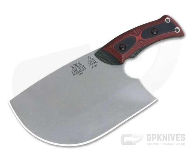 The XXX Dicer is a standalone piece for the kitchen out of TOPS’ Dicer line of kitchen knives. Its use is a bit of an enigma. Similar to the wide, sweeping blade of the Native Alaskan Ulu, the XXX Dicer combines the functionality of a spatula with that of a cleaver and a chef’s knife. Almost 4” at its widest point, this is a blade with a lot of belly for slicing while the handle, similar to the Dicer 8, is contoured but pushed forward into the blade providing a comfortable pinch grip in use. Whatever food preparation you do you can use the flat of the blade to transfer from chopping board to pan or plate. This is a versatile kitchen tool you’ll use again and again. The XXX Dicer comes with a tumbled 440C blade and Red & Black G10 scales over thick black canvas Micarta liners.