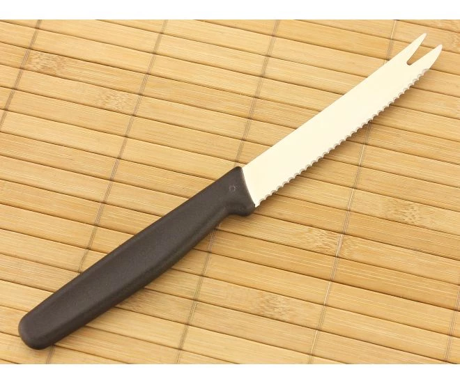 Victorinox Tomato Knife with 4.25″ serrated Swiss stainless steel blade with forked tip blade. Black ergonomic handle designed to minimize wrist tension. Packaged in plastic sleeve.